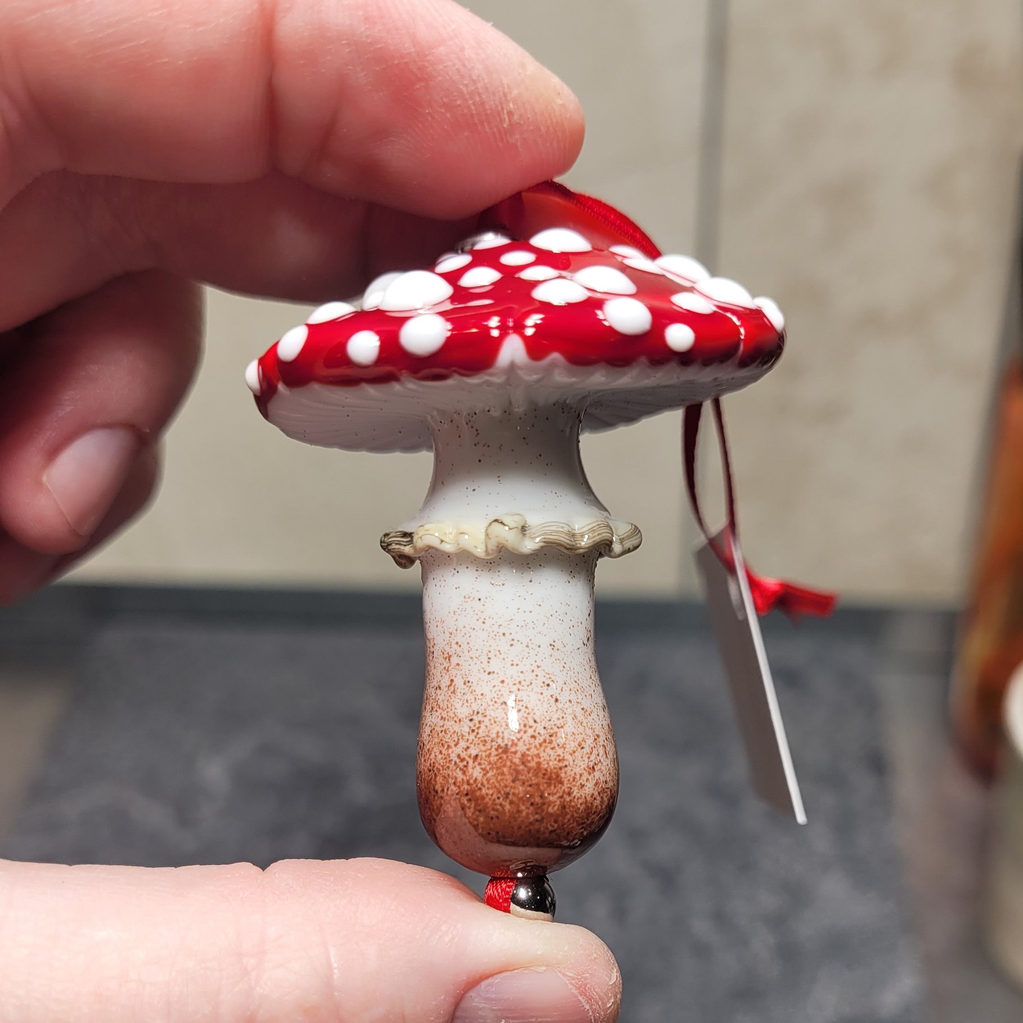 This is a new line of glass sculptures in my "Seasonal" series... this is little Yuletide Fly Agaric/Amanita Muscaria mushroom ornament.