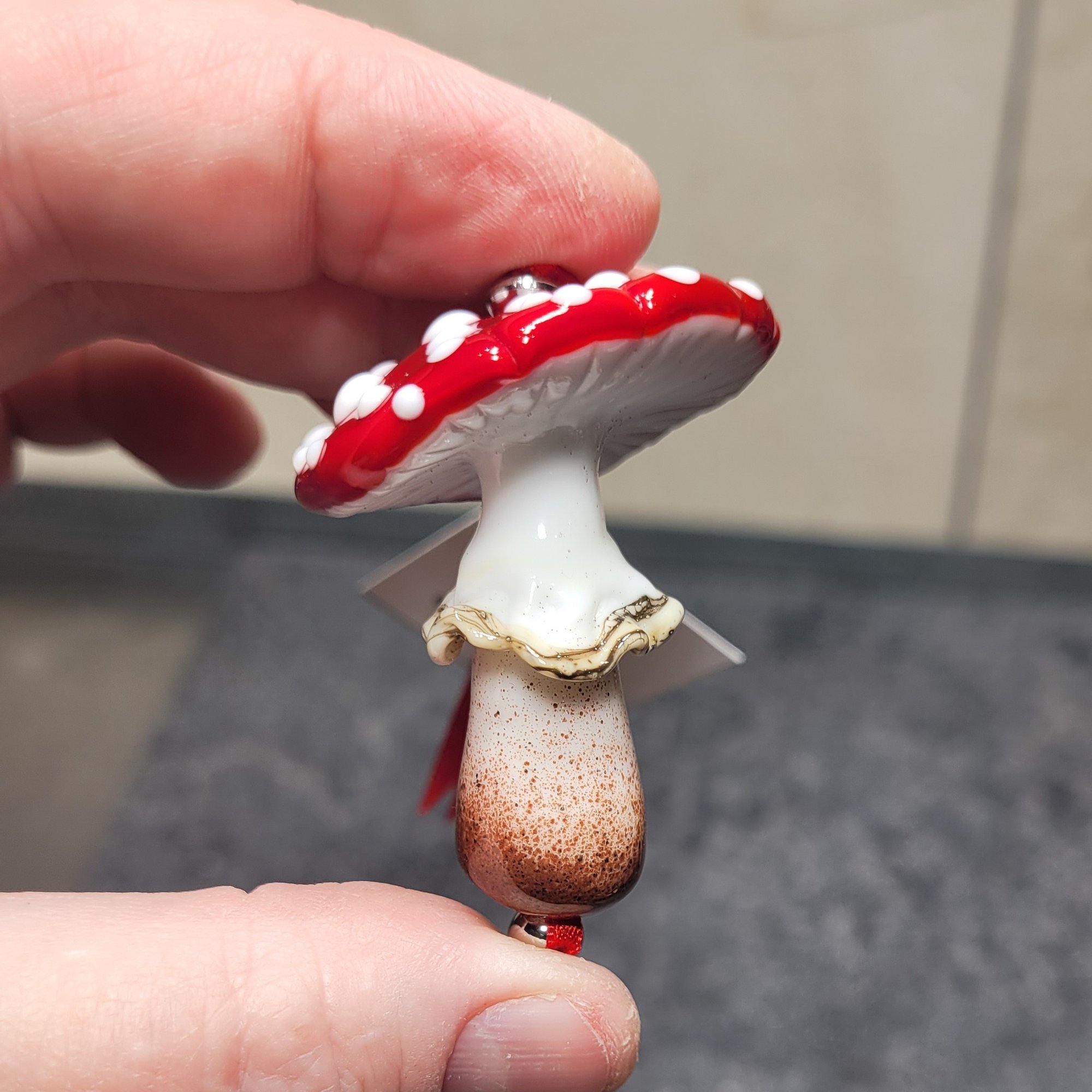 This is a new line of glass sculptures in my "Seasonal" series... this is little Yuletide Fly Agaric/Amanita Muscaria mushroom ornament.