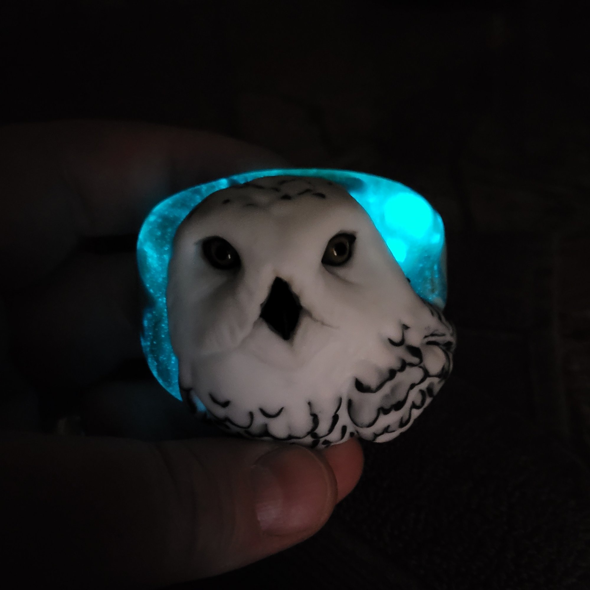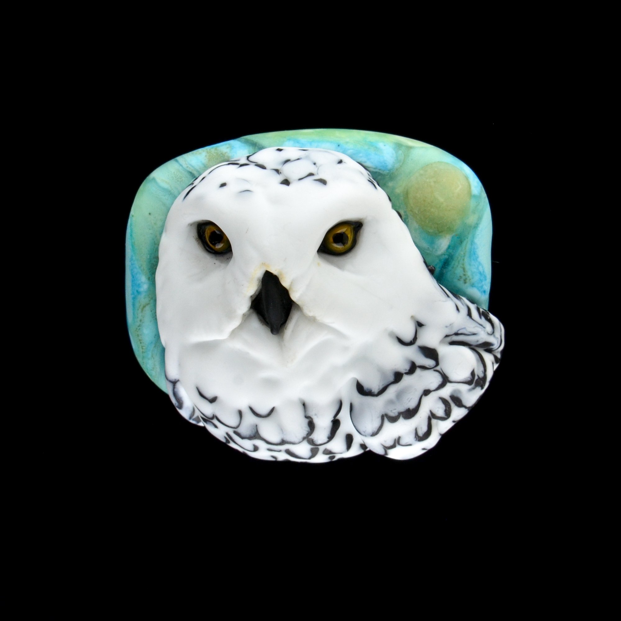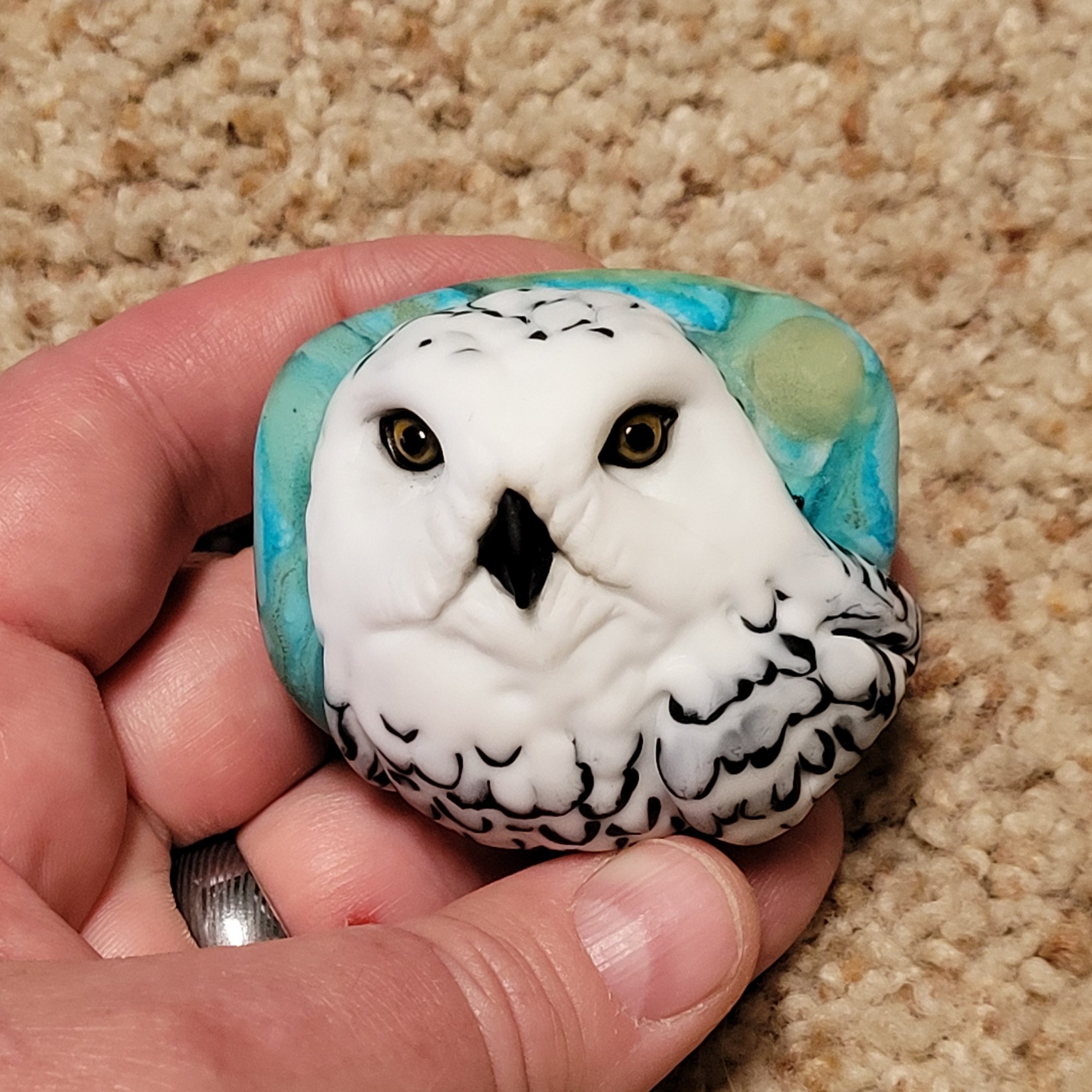 1 XXL. Snowy Owl "Nightowl" sculpture with a wooden display base @ $235